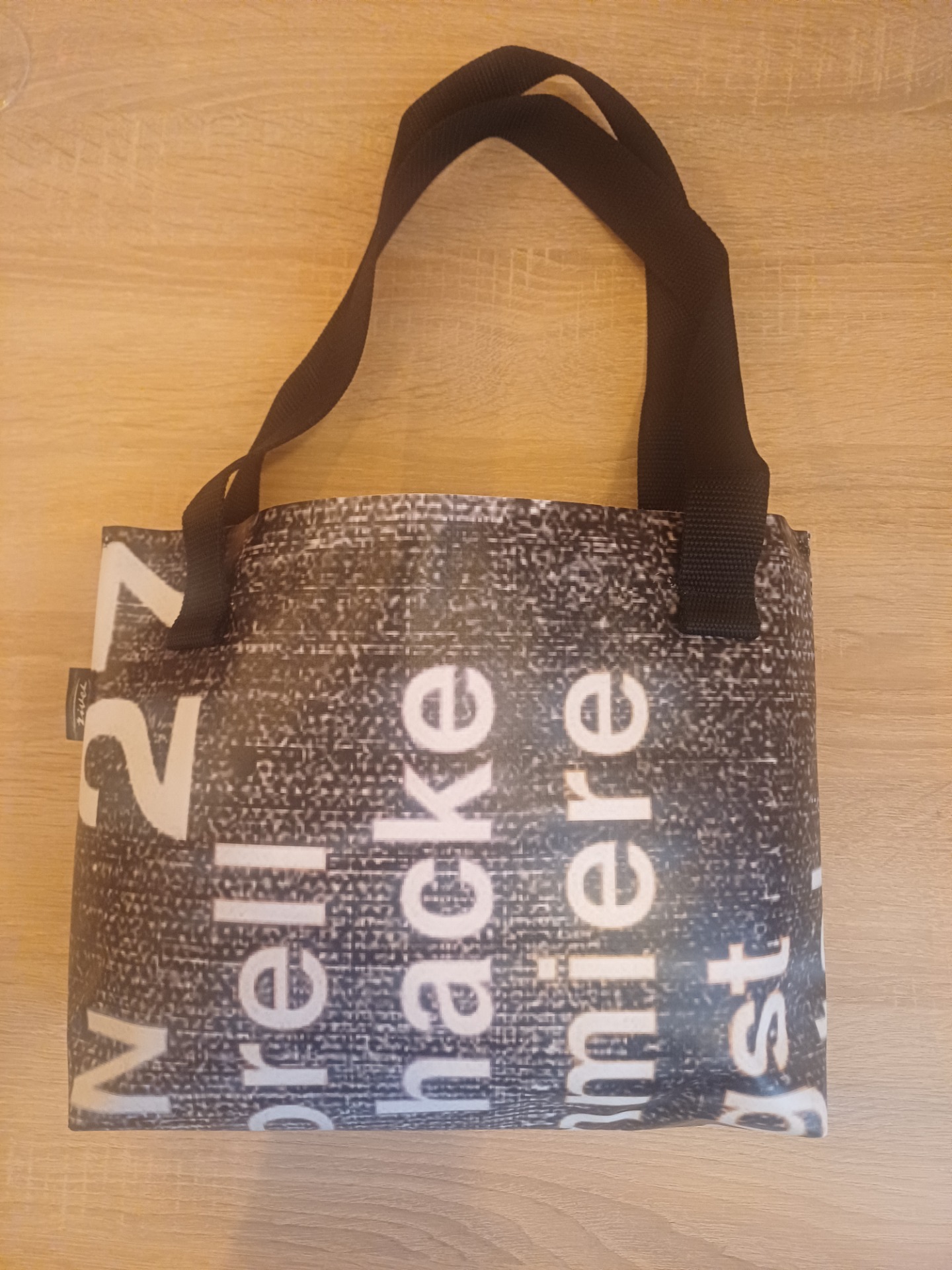 Dámská taška z banneroviny s vnitřní kapsou z šusťákoviny s motivem obálky č. 27 s černými uchy, délka černých popruhů – 65 cm, úchyt pro karabinu na klíč.