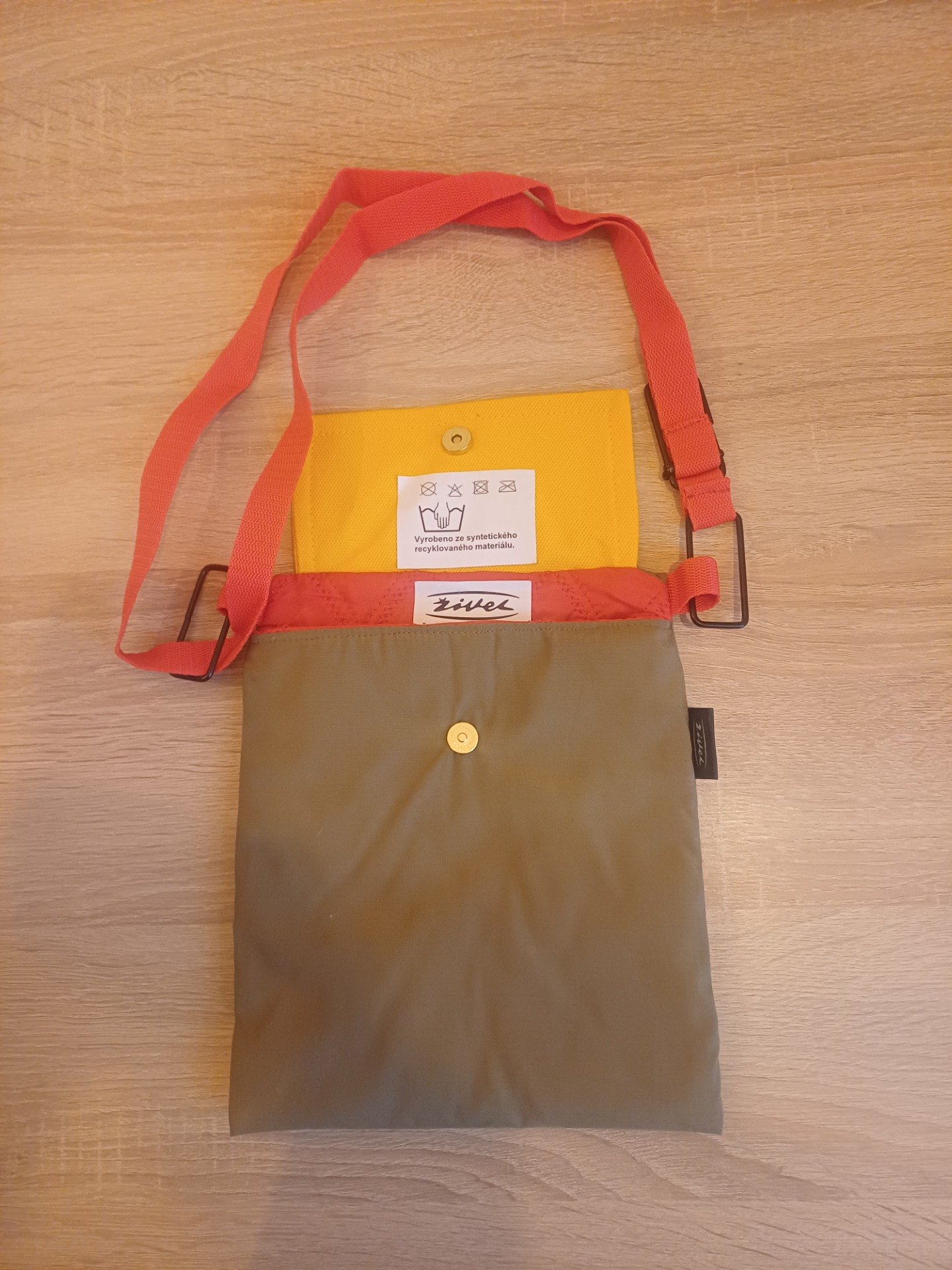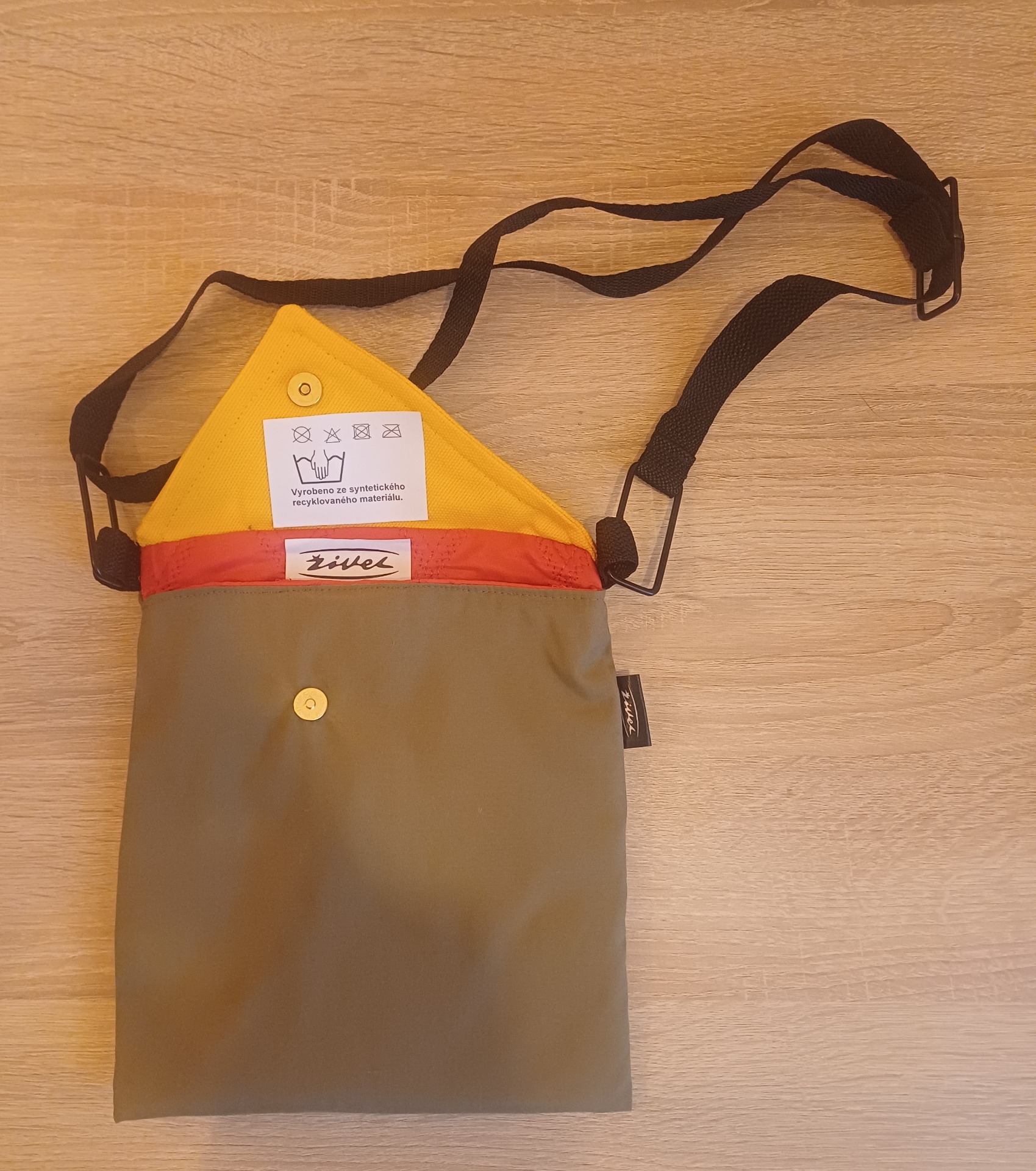 Dokladovka z nepromokavého materiálu s vnitřní kapsou s černým nebo červeným nastavitelným popruhem s uzavíratelnou chlopní na magnet. Výrobek je vyroben v duchu upcyklace.