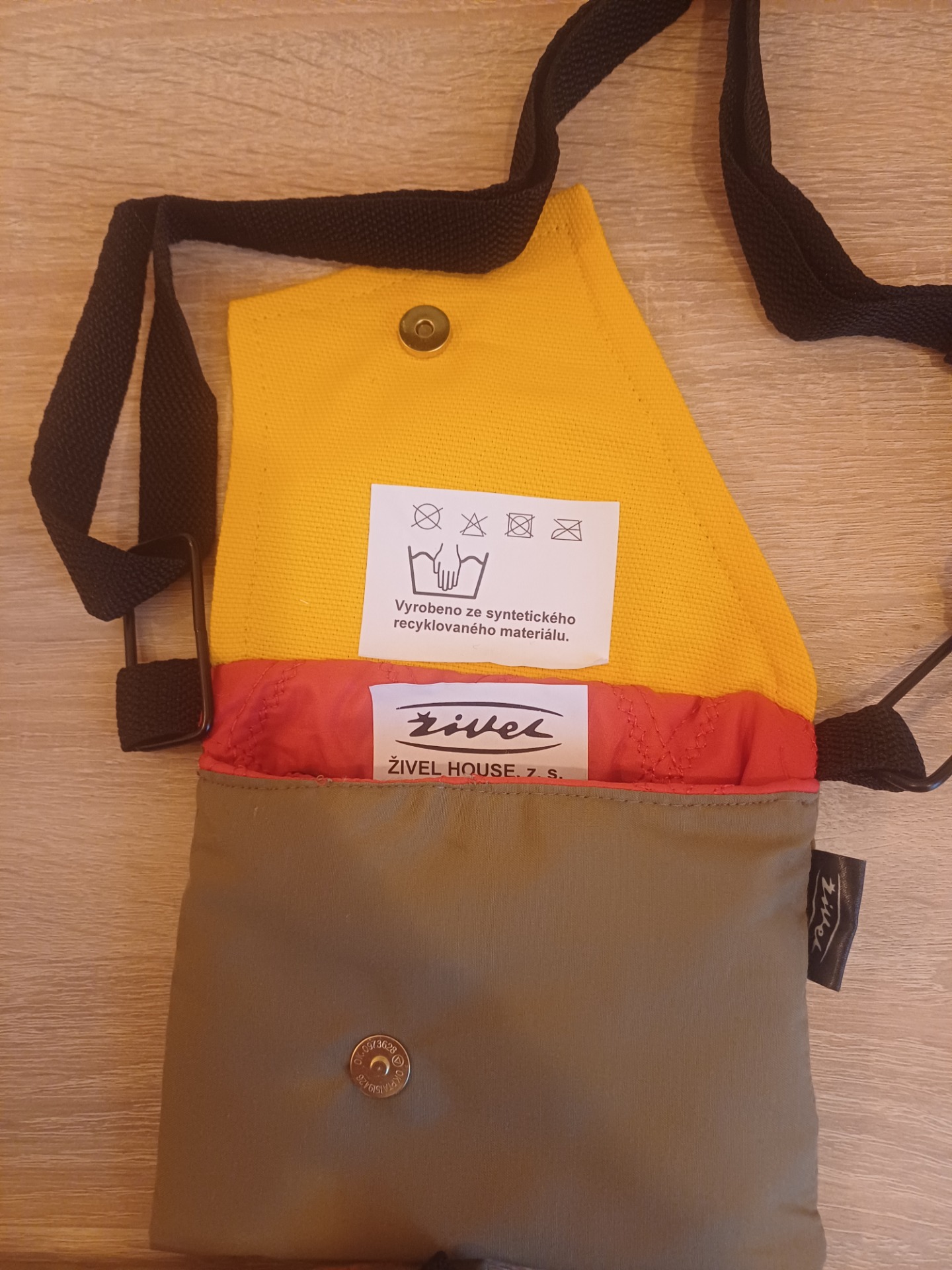 Dokladovka z nepromokavého materiálu s vnitřní kapsou s černým nebo červeným nastavitelným popruhem s uzavíratelnou chlopní na magnet. Výrobek je vyroben v duchu upcyklace.