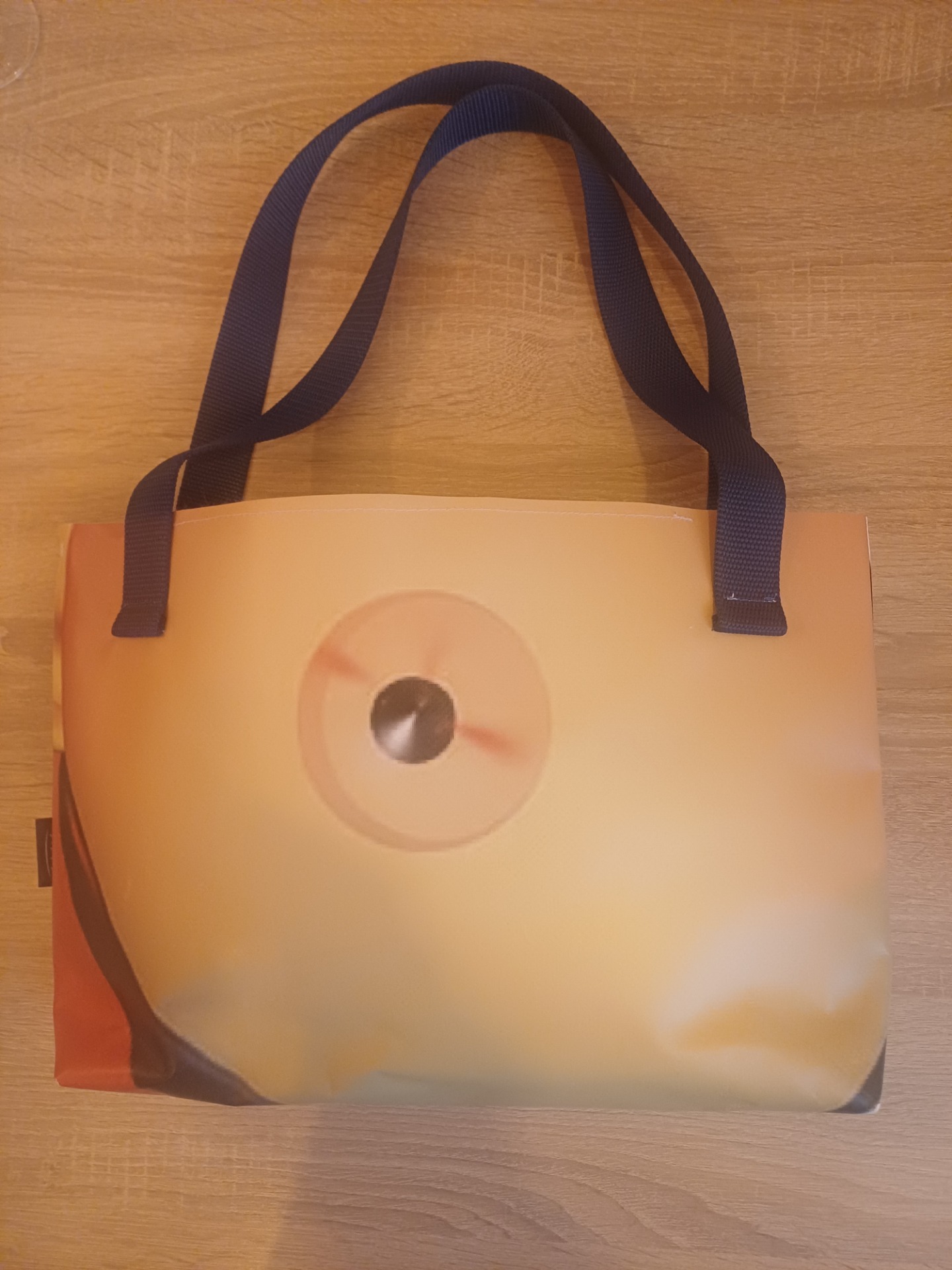 Dámská taška s vnitřní kapsou z banneroviny motivem obálky č. 18 s černými uchy, délka modrých popruhů – 65 cm, úchyt pro karabinu na klíče.