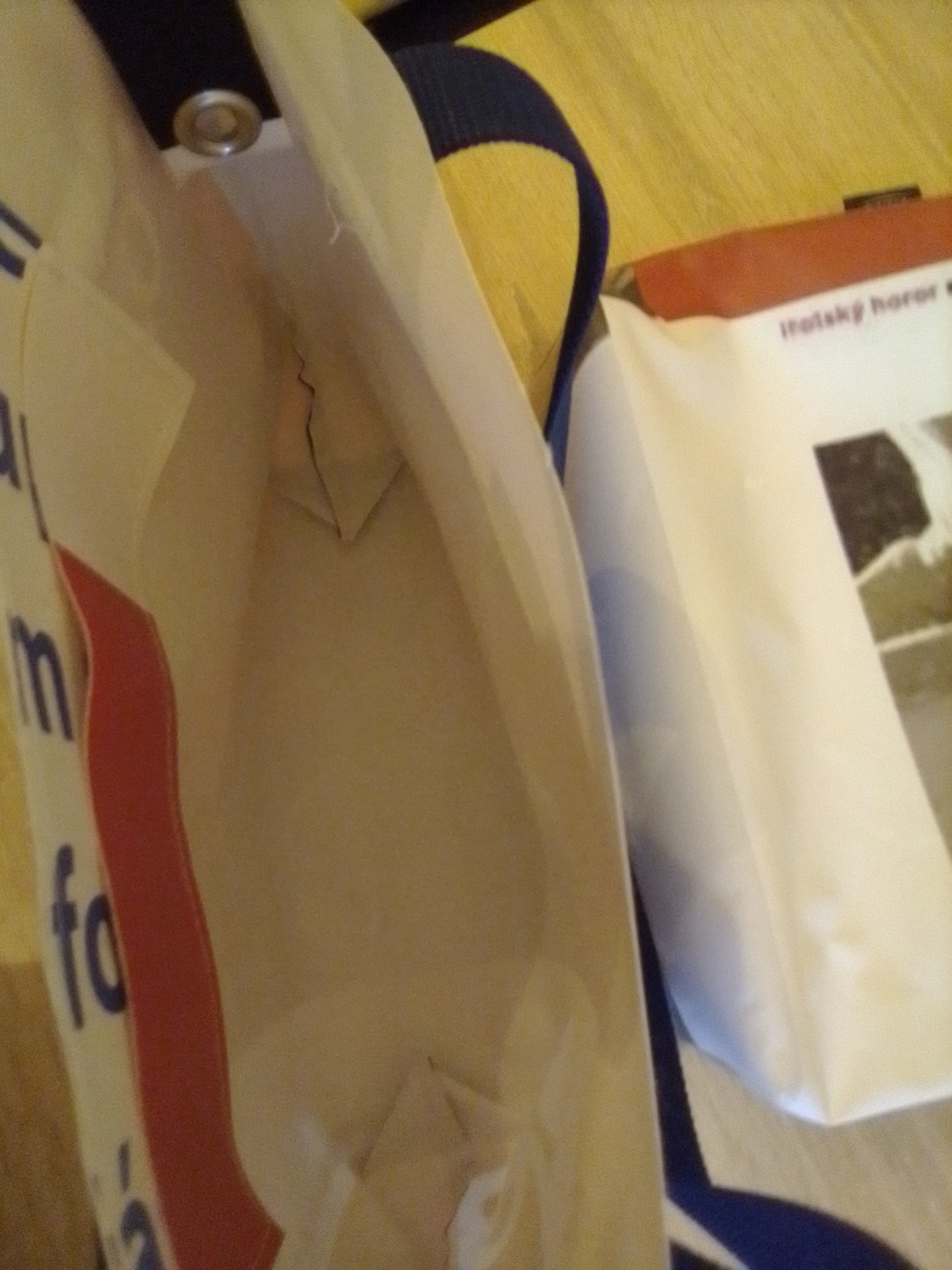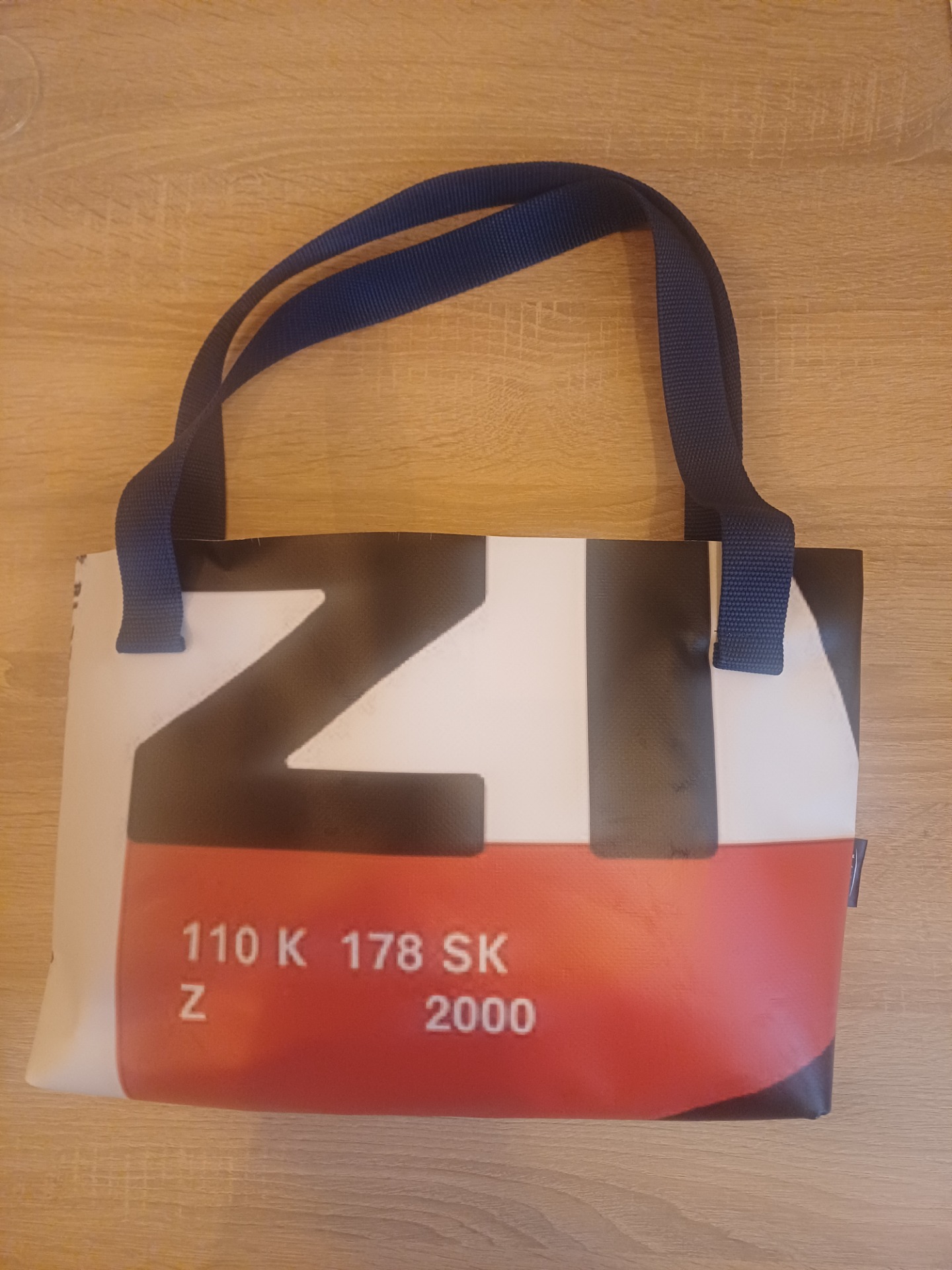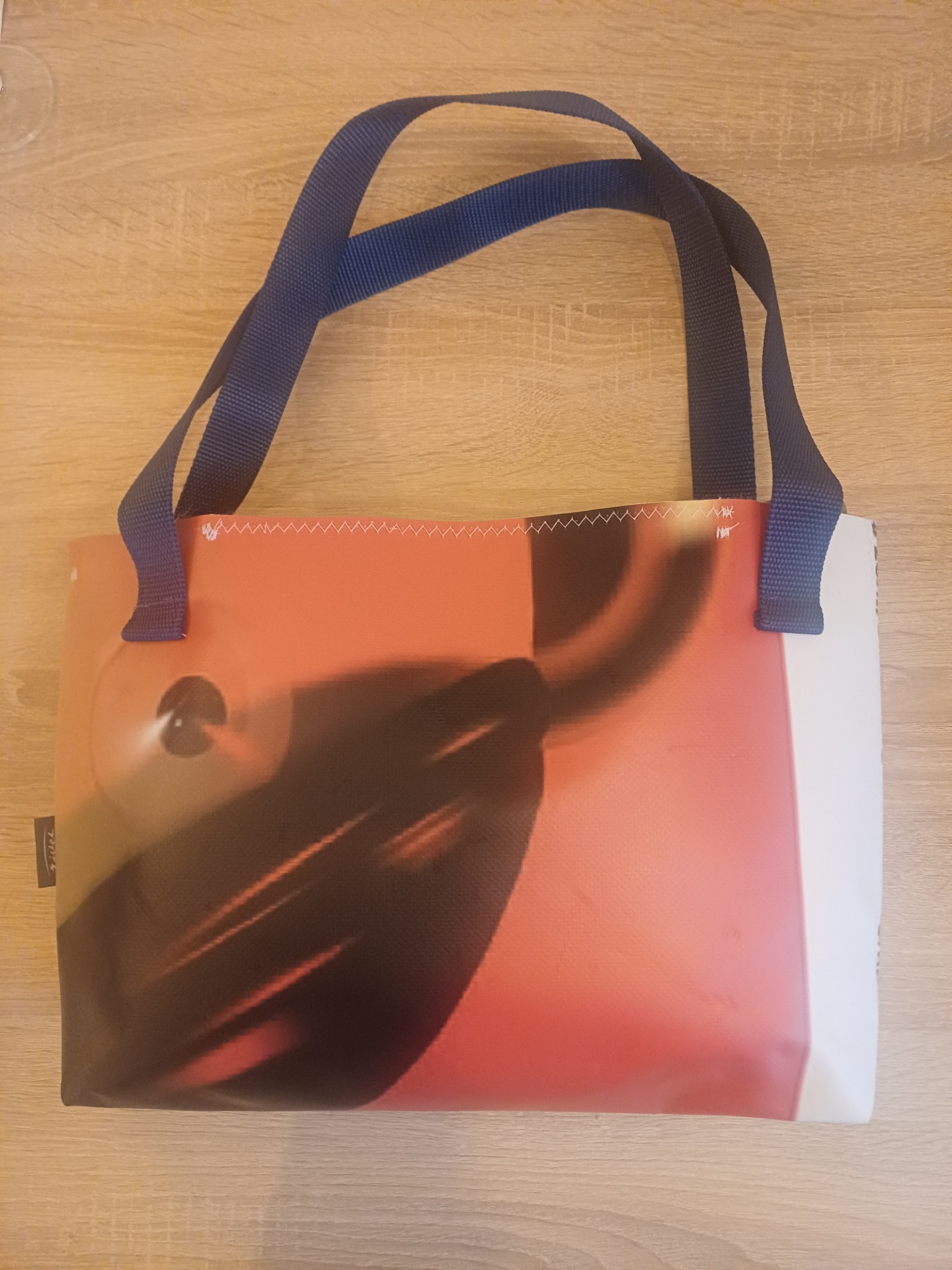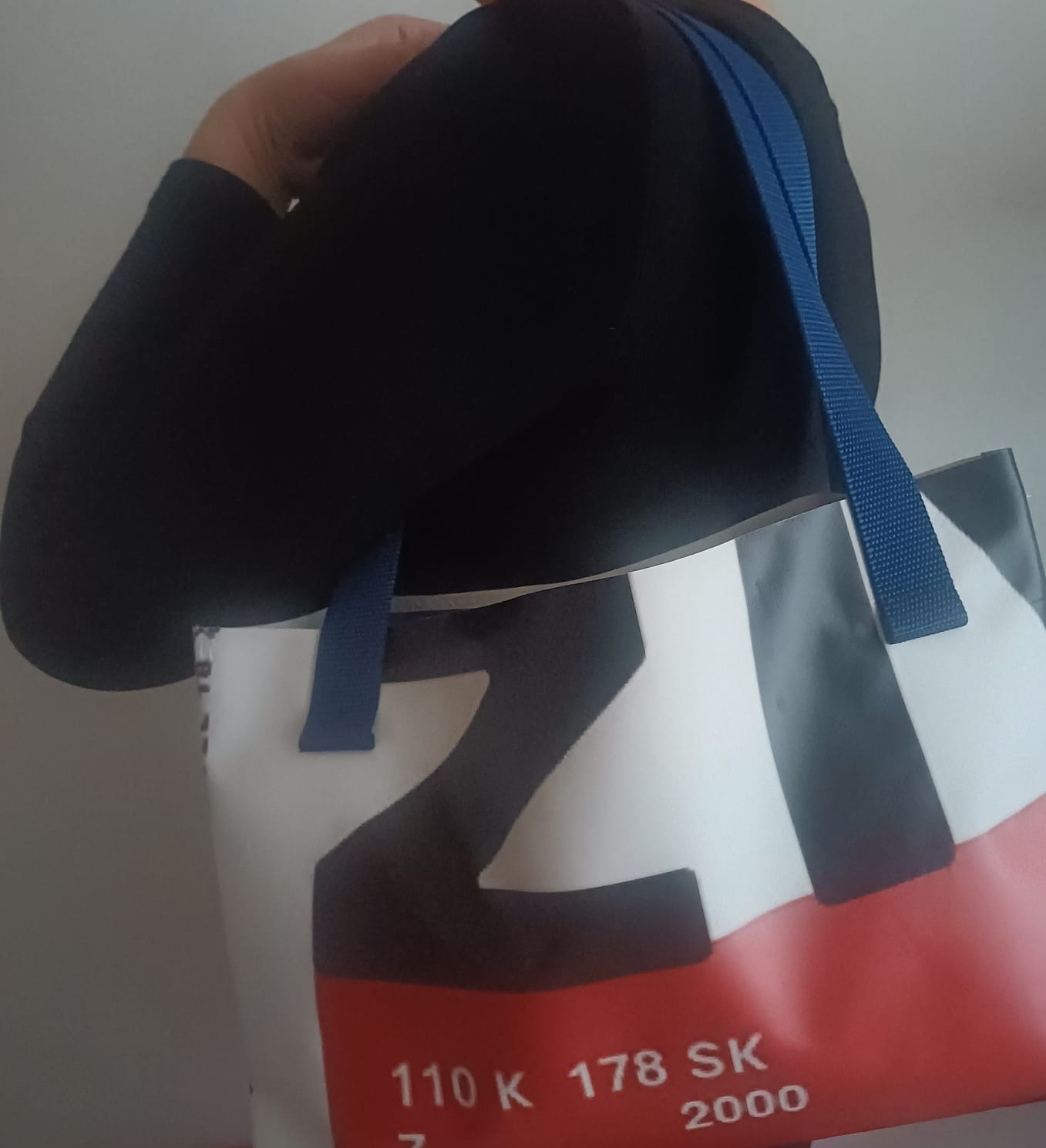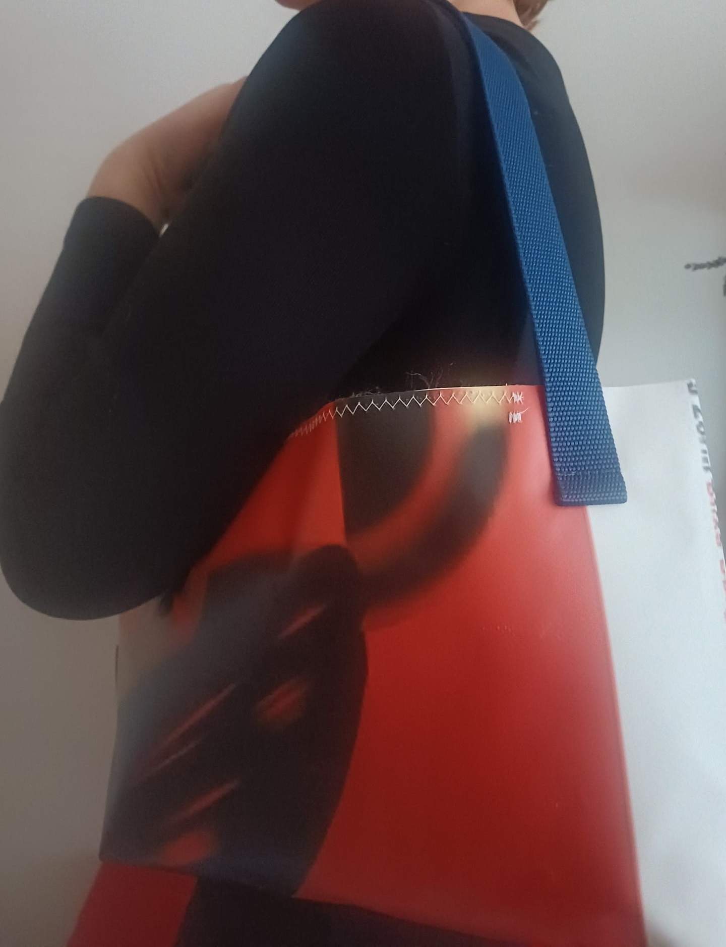 Dámská taška s vnitřní kapsou z banneroviny motivem obálky č. 18 s černými uchy, délka modrých popruhů – 65 cm, úchyt pro karabinu na klíče.