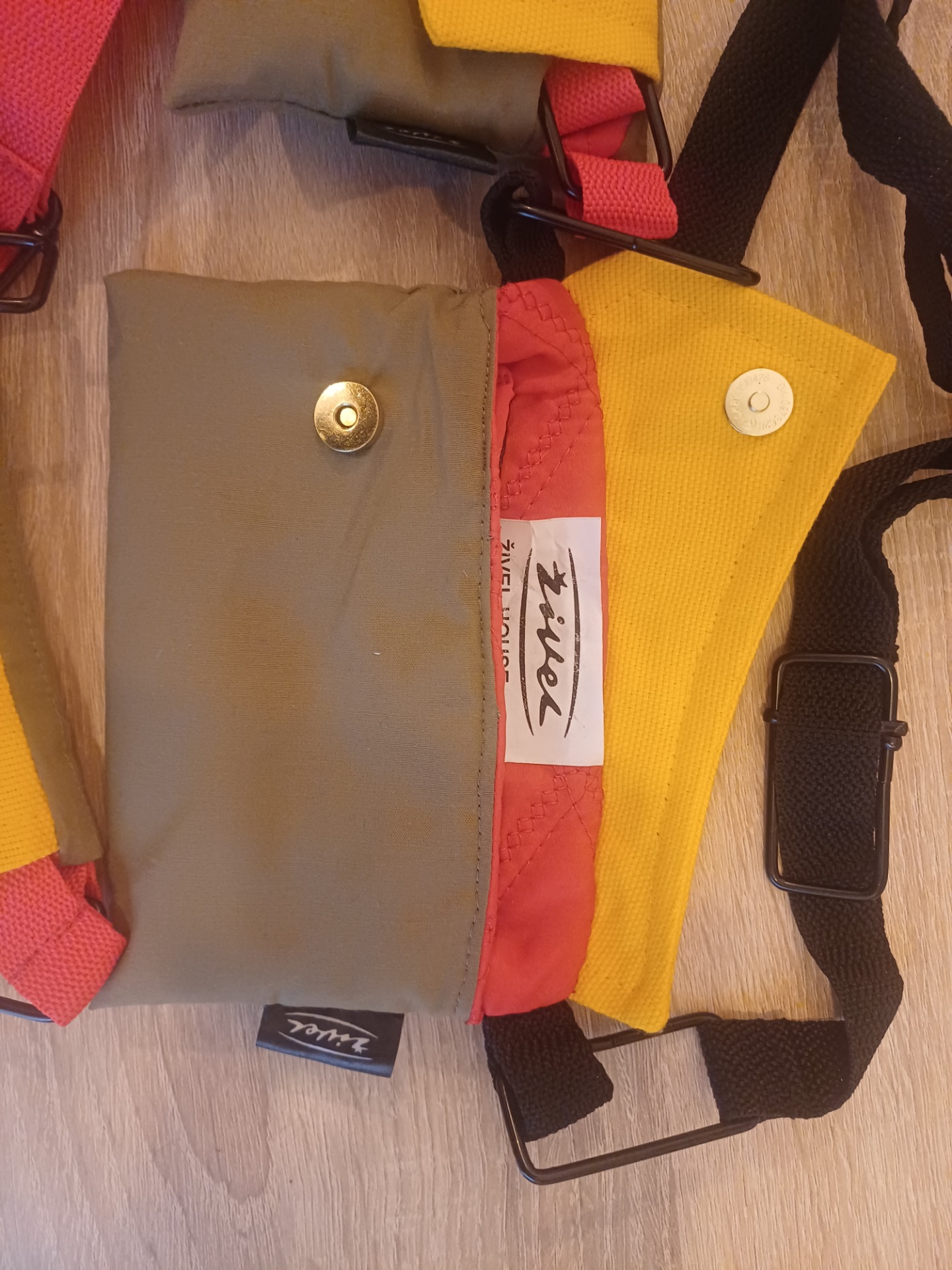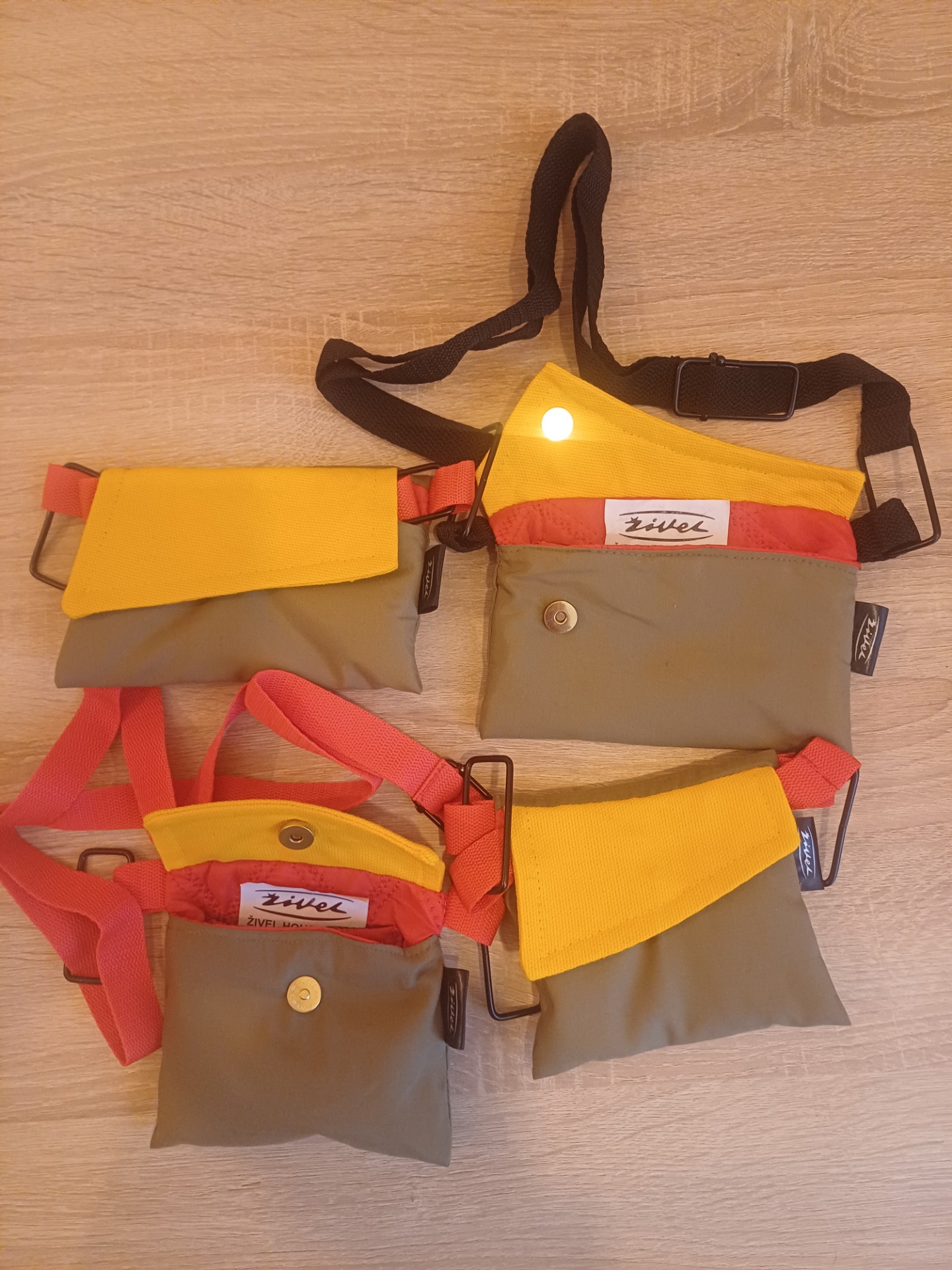 Barva a materiál: zelená tkanina, červená podšívka, žlutá chlopeň, syntetický černý nebo červený popruh