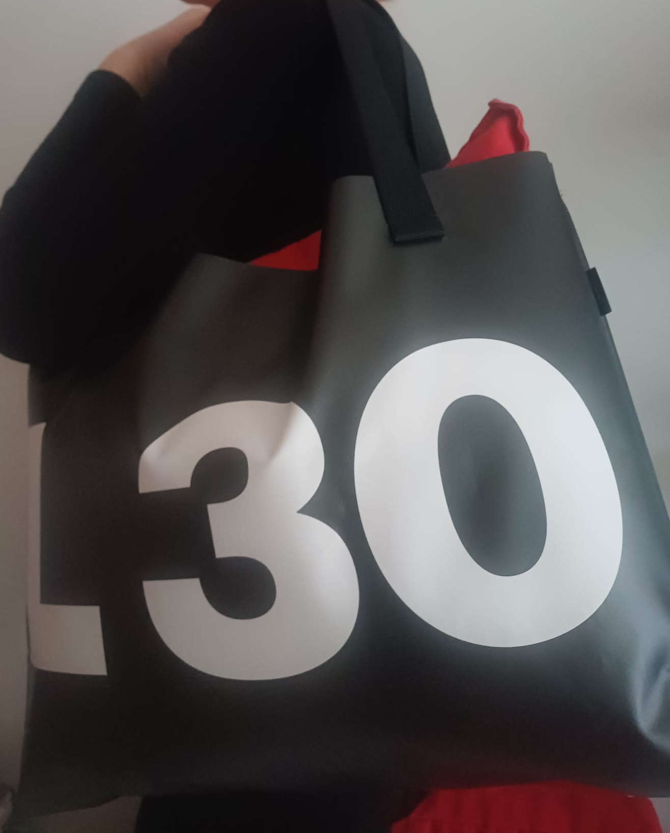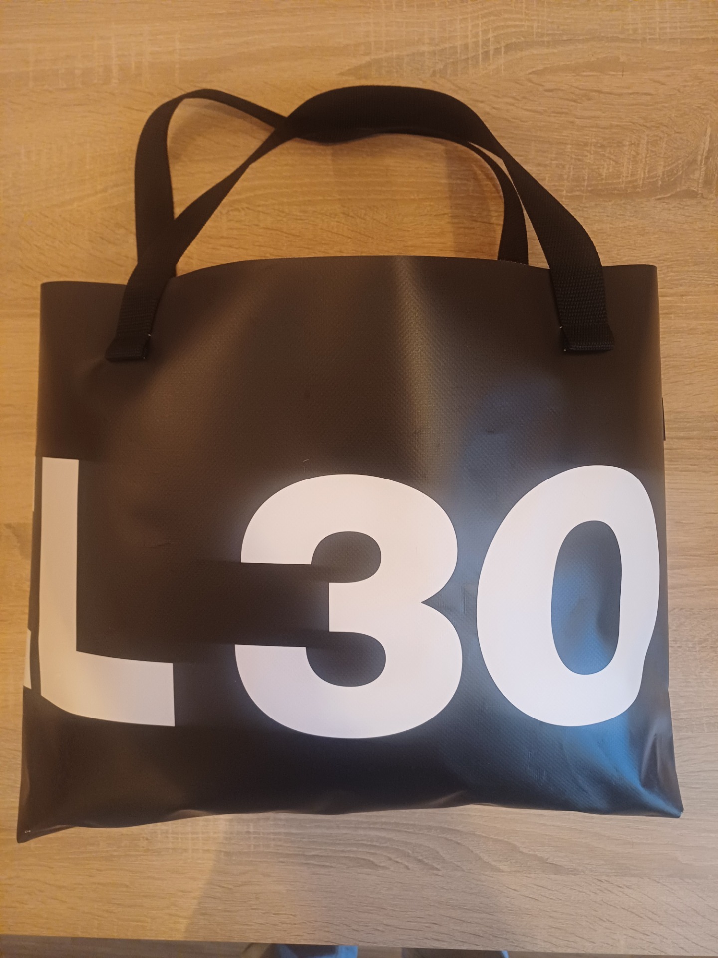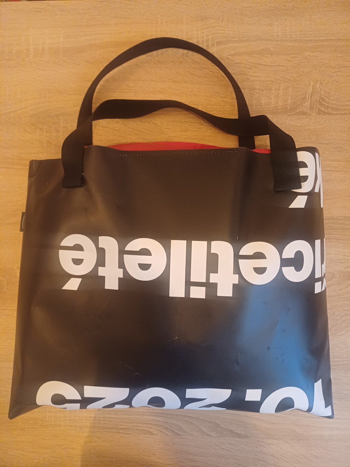 Barva: černá a bíláMateriál: bannerovina, syntetický černý popruhVelikost: 50 x 40 cm