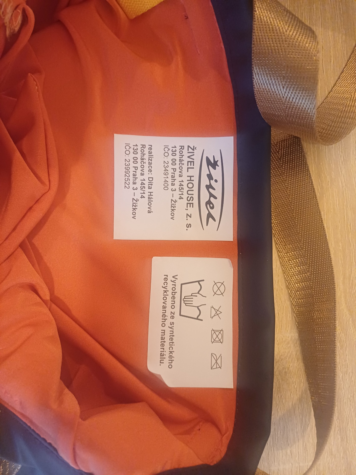 Ušity jsou z nepromokavého materiálu s bannerovou kapsou s částí motivu první obálky v rozměrech 35 x 27 cm, délka modrobílých popruhů – 65 cm. Mají úchyt pro karabinu na klíče a s oranžovou úpletovou podšívkou s praktickou vnitřní kapsou.